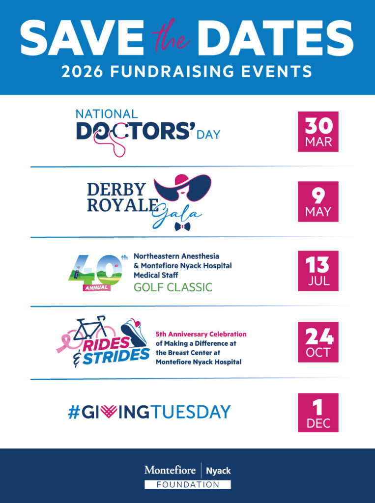 The Montefiore Nyack Foundation is excited to share our upcoming 2026 events and celebrations. Mark your calendars now—we look forward to seeing you throughout the year!